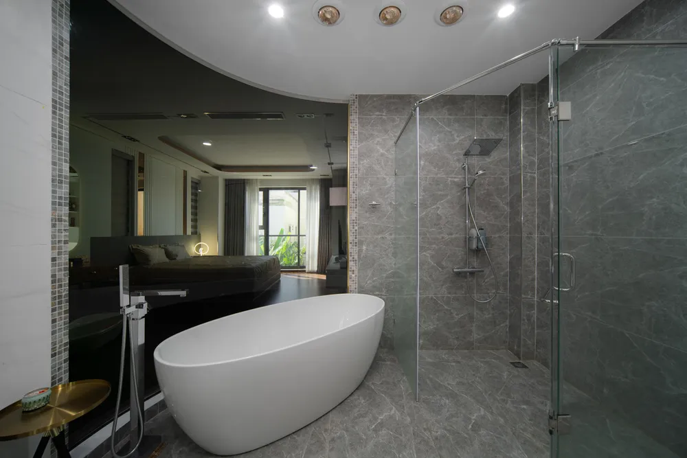 Tường ngăn cách giữa phòng tắm với phòng ngủ master được thiết kế dạng vòm cong giúp làm mềm không gian.