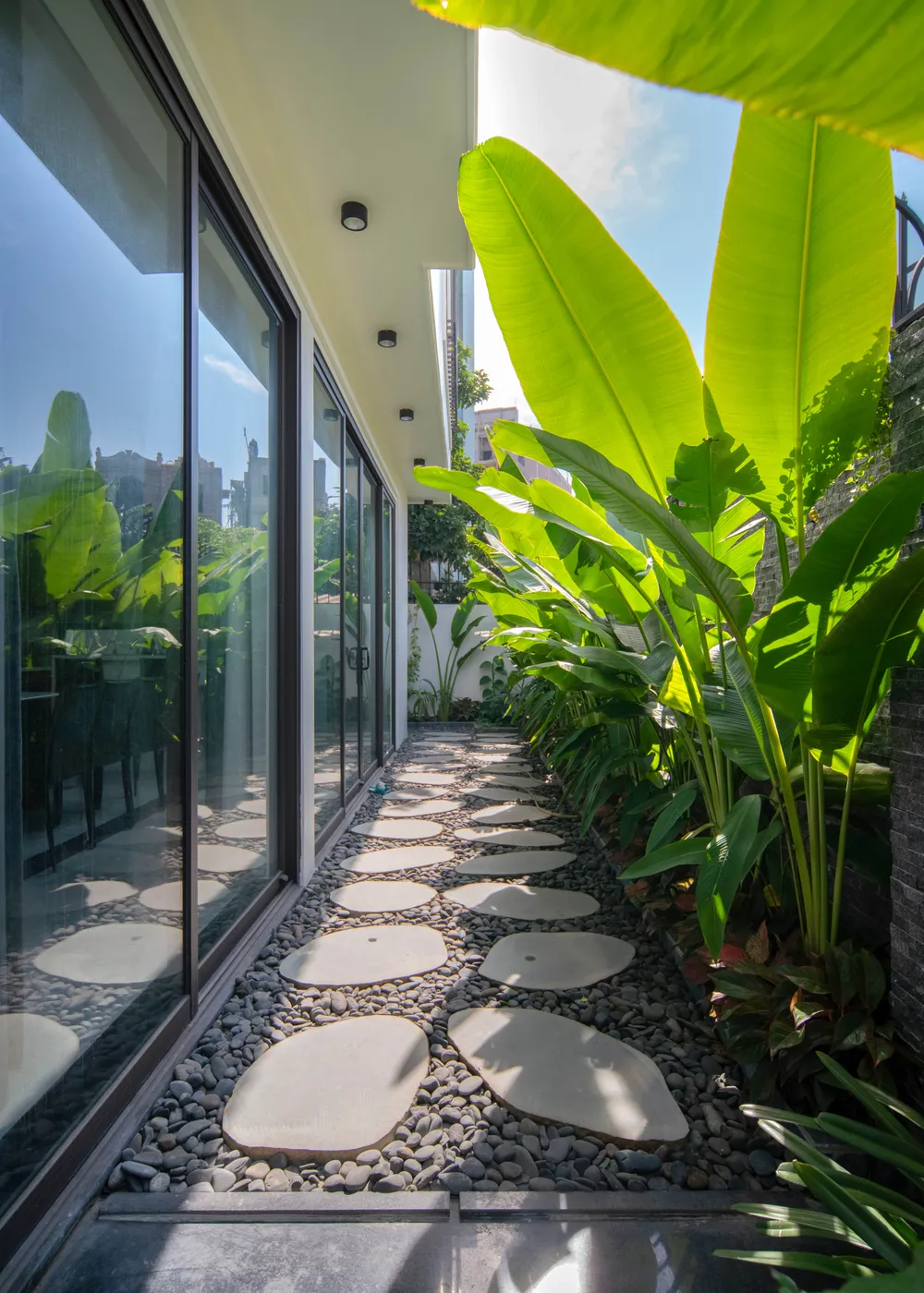 KTS còn dành diện tích cho lối đi bên hông. Con đường được lát đá, rải sỏi tự nhiên và hàng chuối cảnh trồng xuyên suốt.
