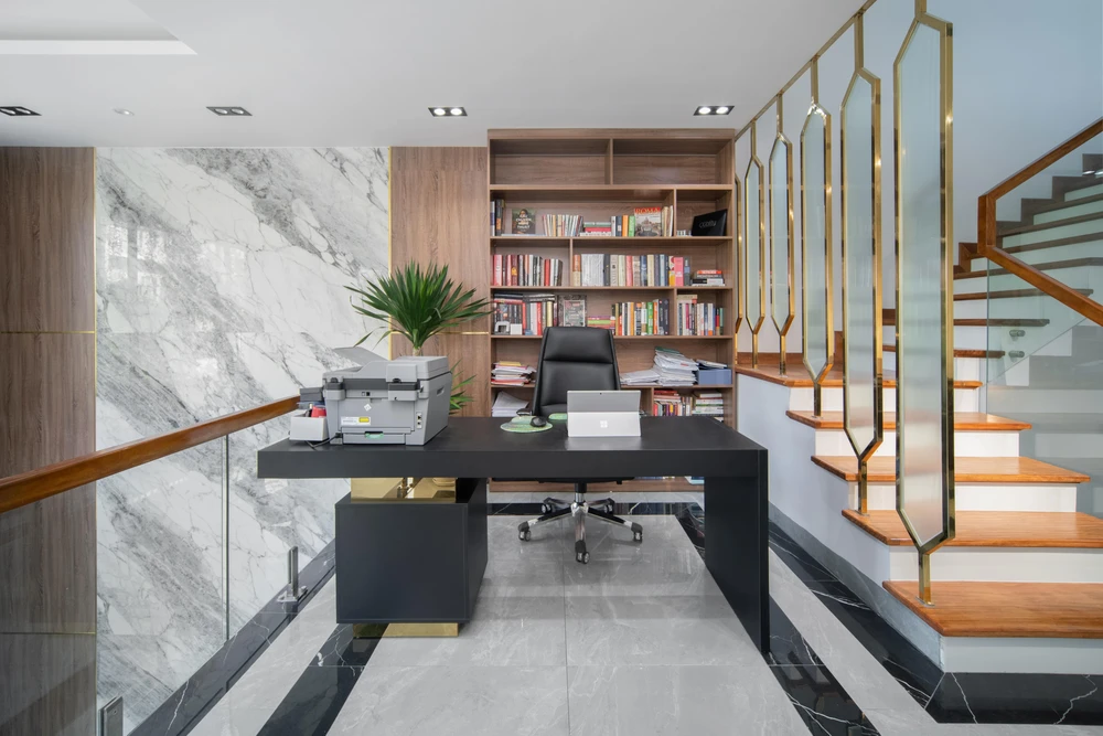 Khu vực làm việc được bố trí ở tầng lửng của ngôi nhà.