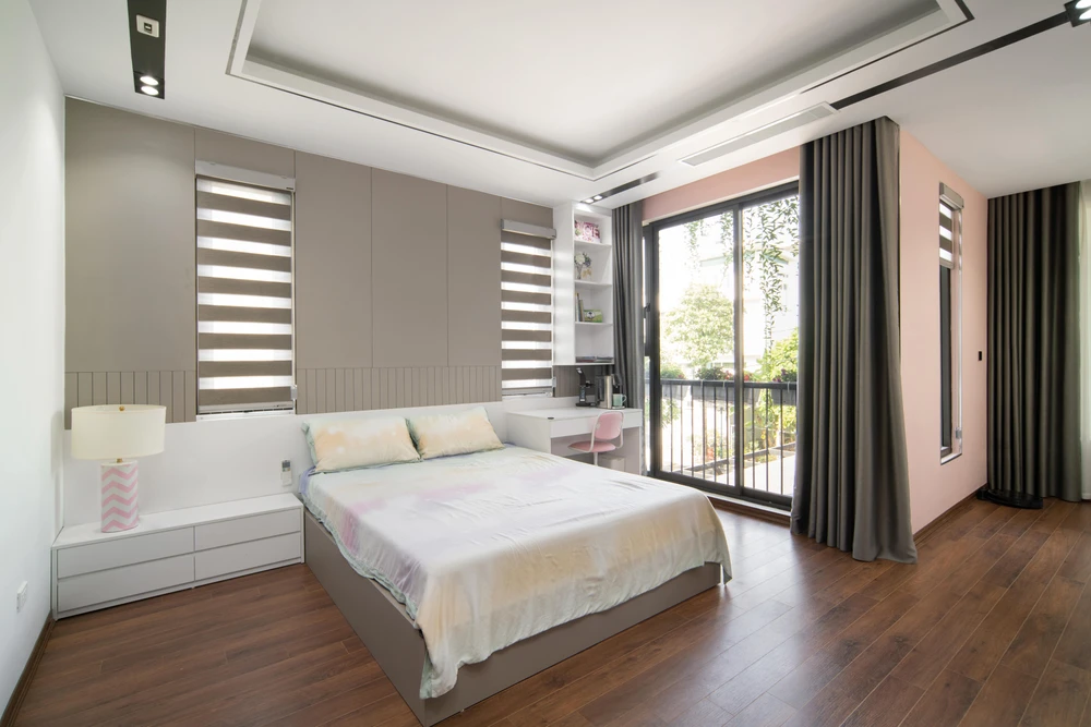 Phòng ngủ của con gái có diện tích nhỏ hơn, có bàn học đặt hướng ra ngoài cửa sổ và gần ban công để có nhiều ánh sáng tự nhiên vào ban ngày.