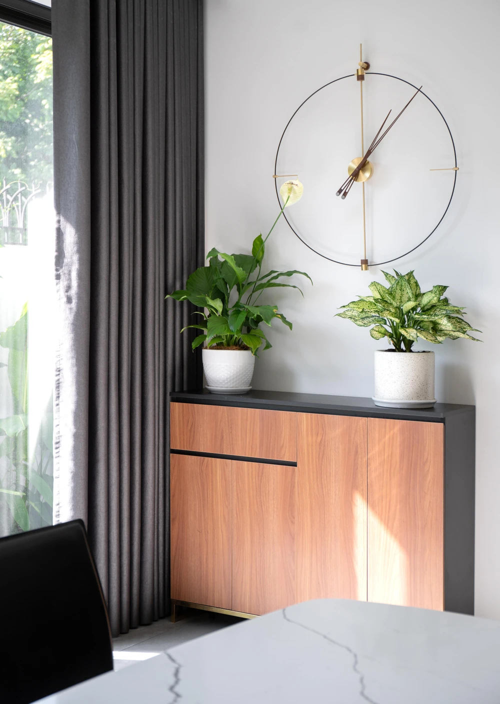 Dù được thiết kế mở nhưng KTS đã phân chia không gian một cách khéo léo bằng vách ngăn kiêm tủ gỗ trang trí.