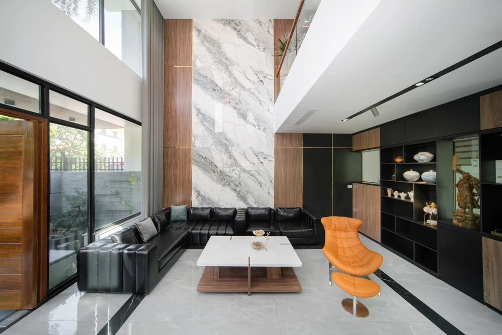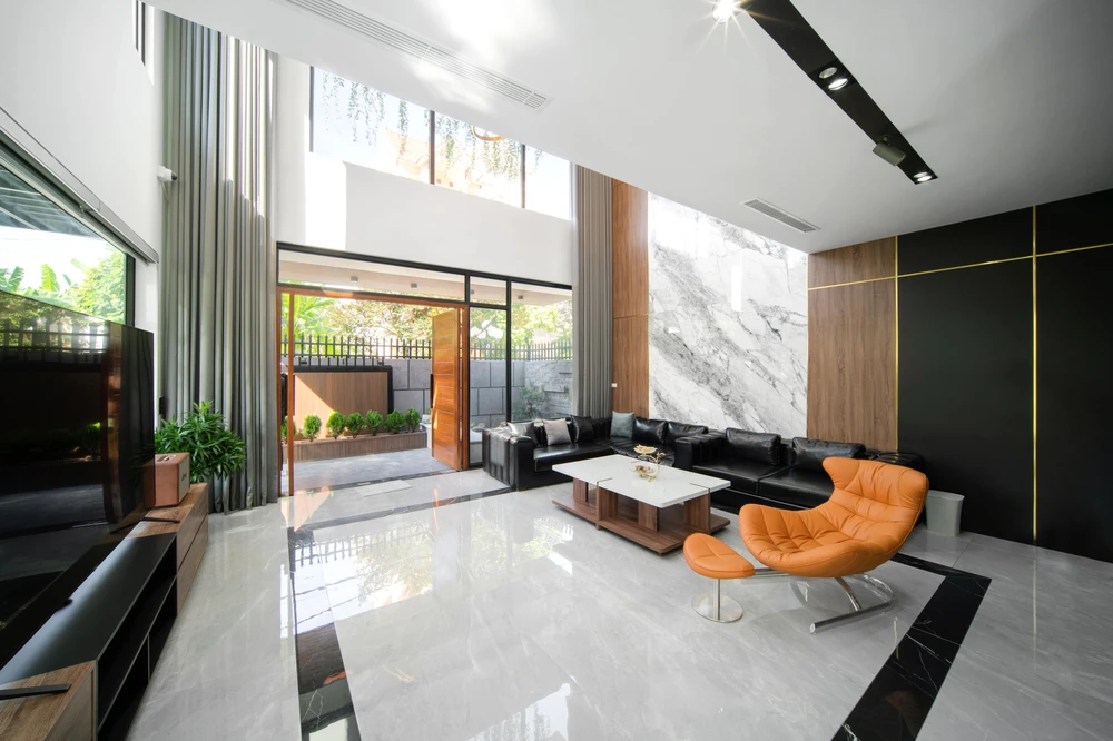 Từ cửa chính bước vào nhà là phòng khách thoáng sáng nhờ thiết kế thông tầng.