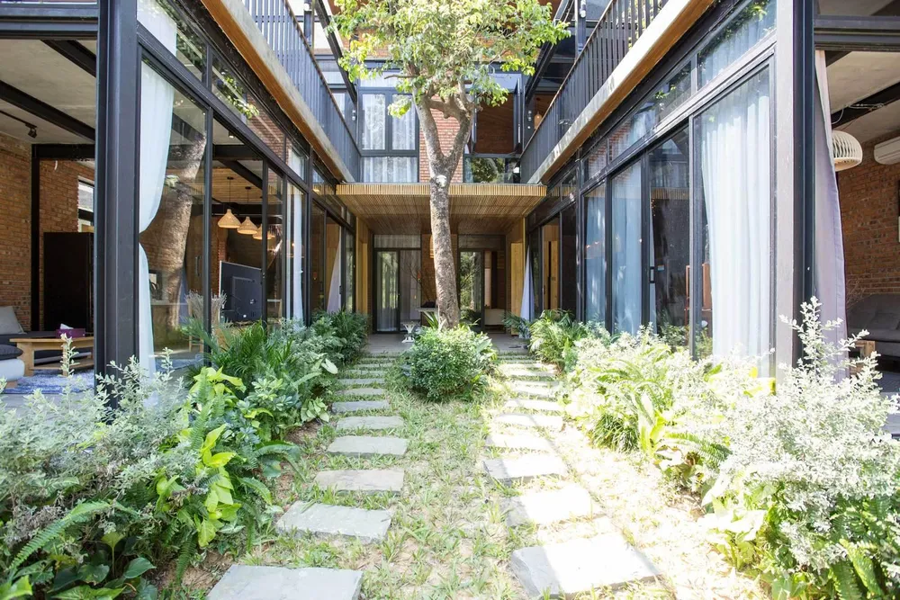 Sân vườn đóng vai trò là không gian trung gian giữa hai nhà, đồng thời là cửa chính ra vào.