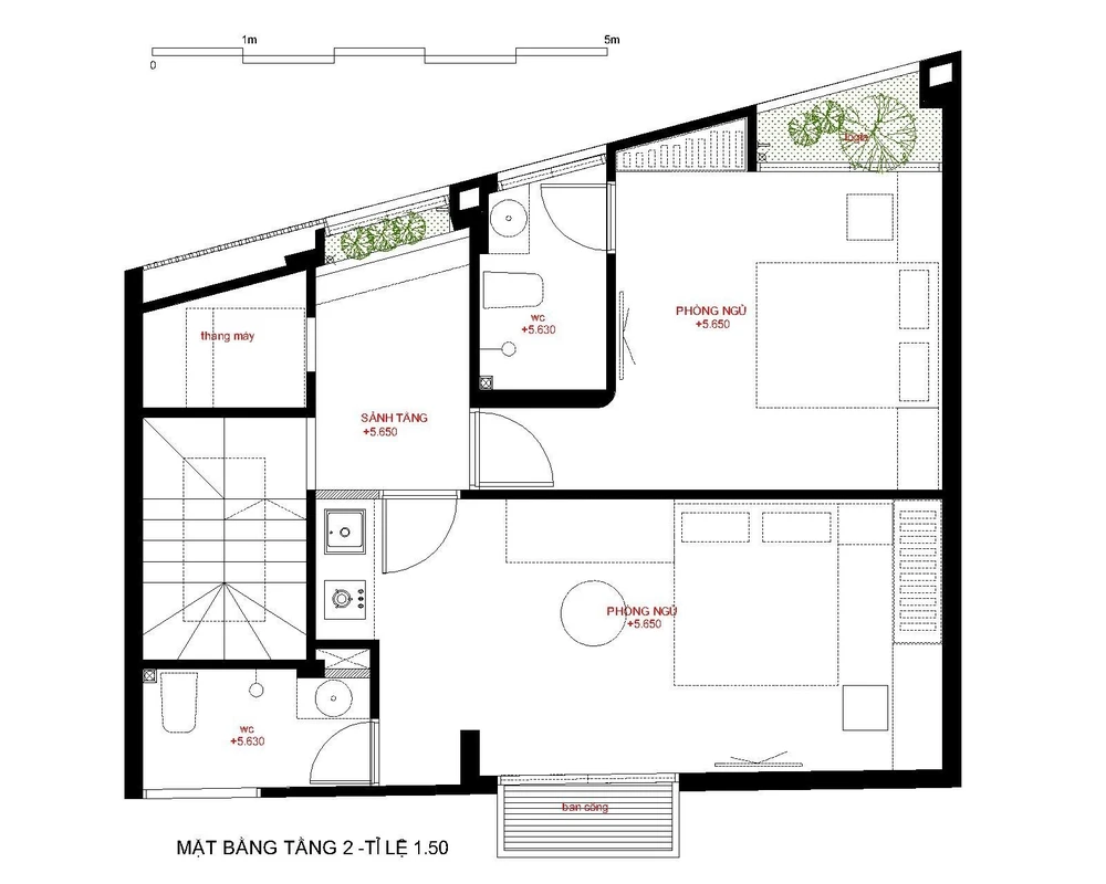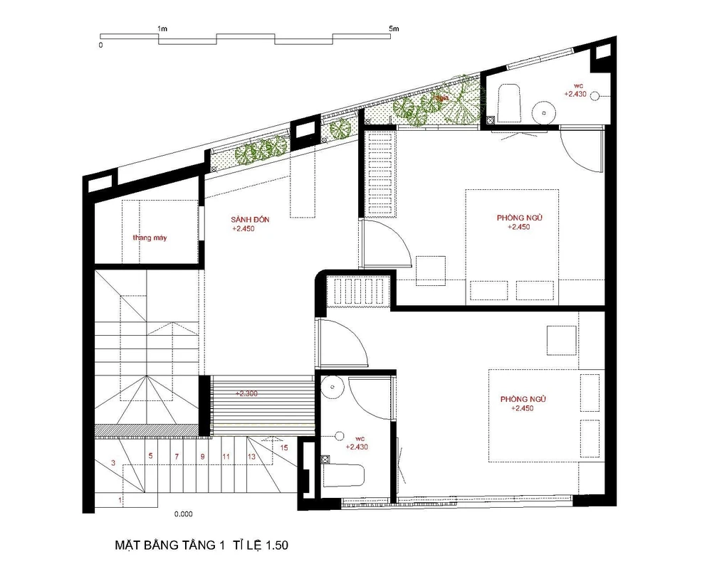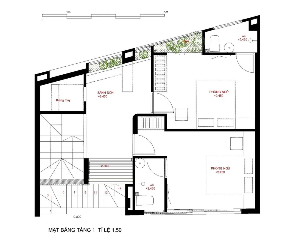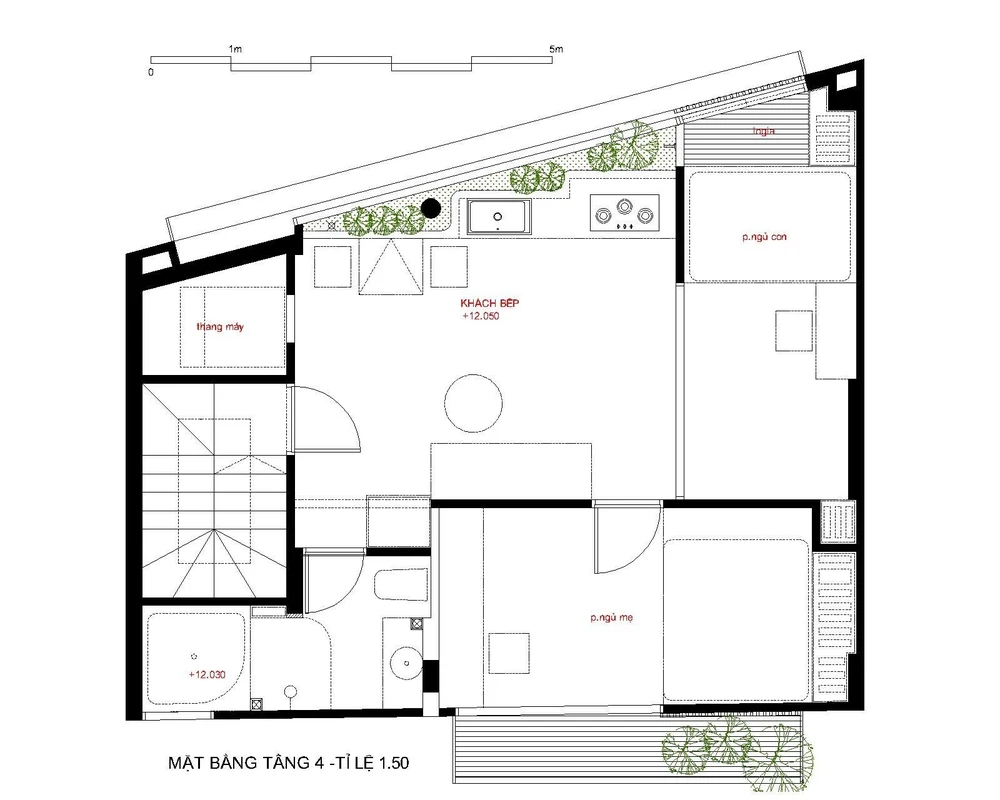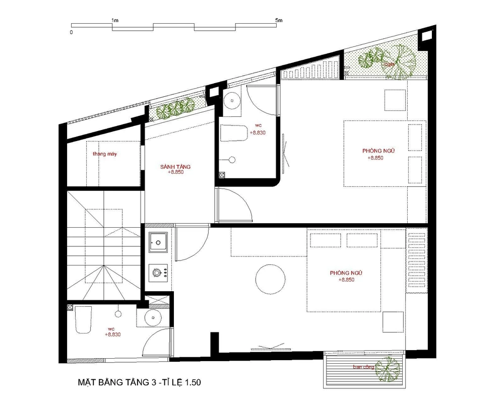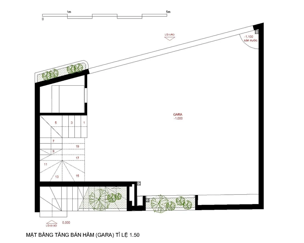 | Diện tích khu đất khá nhỏ và có cạnh xéo nên kiến trúc sư phải cân đối và tính toán công năng để phù hợp với yêu cầu của chủ nhà. |