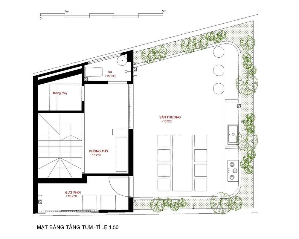 Khu vực sân thượng tòa nhà gồm phòng thờ, vệ sinh, khu giặt, phơi đồ và khoảng sân rộng chứa tối đa 20 người dành cho các bữa tiệc của gia đình. |
