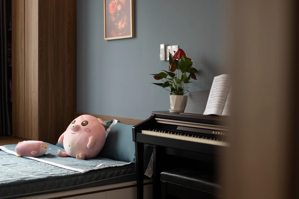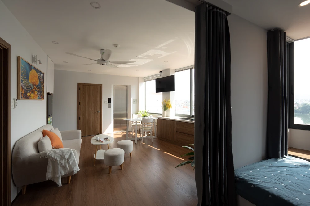 Tầng bốn là khu vực của gia chủ, không gian gồm phòng khách, bếp, vệ sinh, một phòng ngủ chính và một phòng ngủ cho con. |