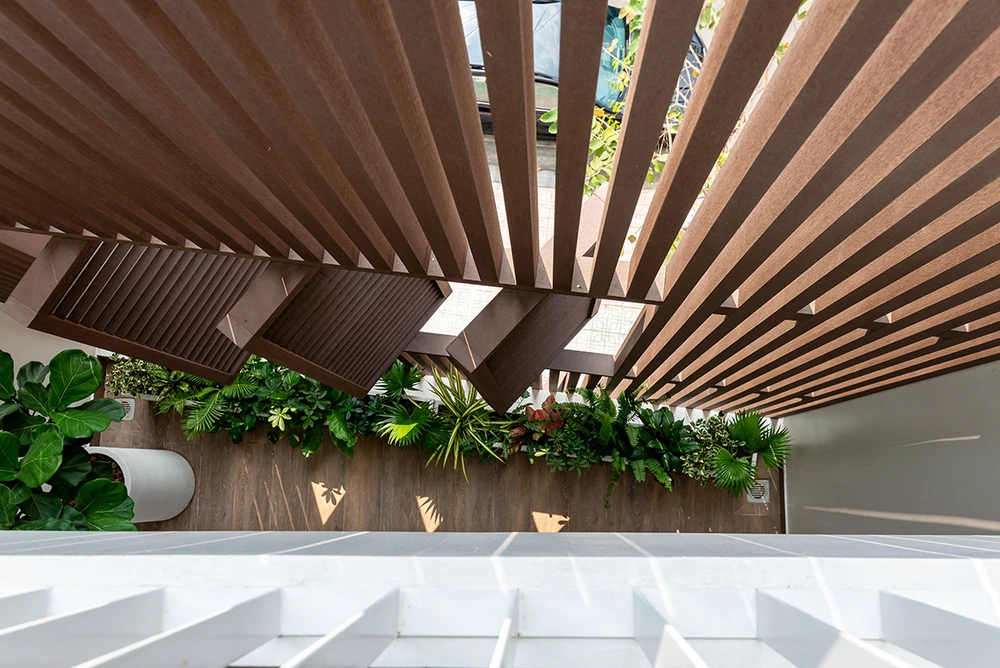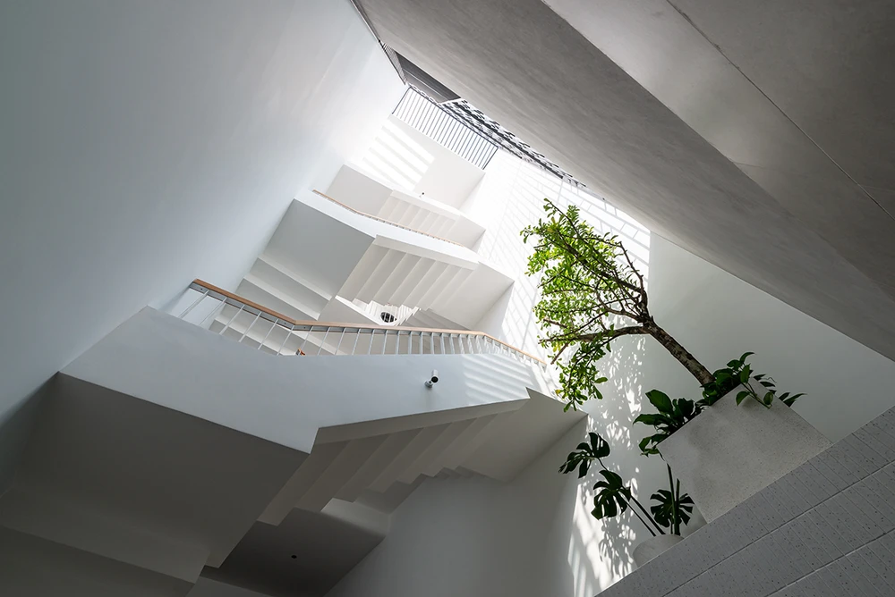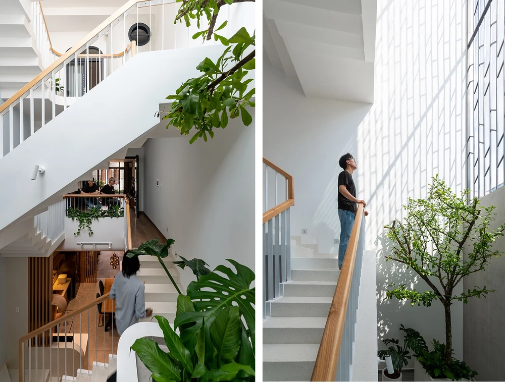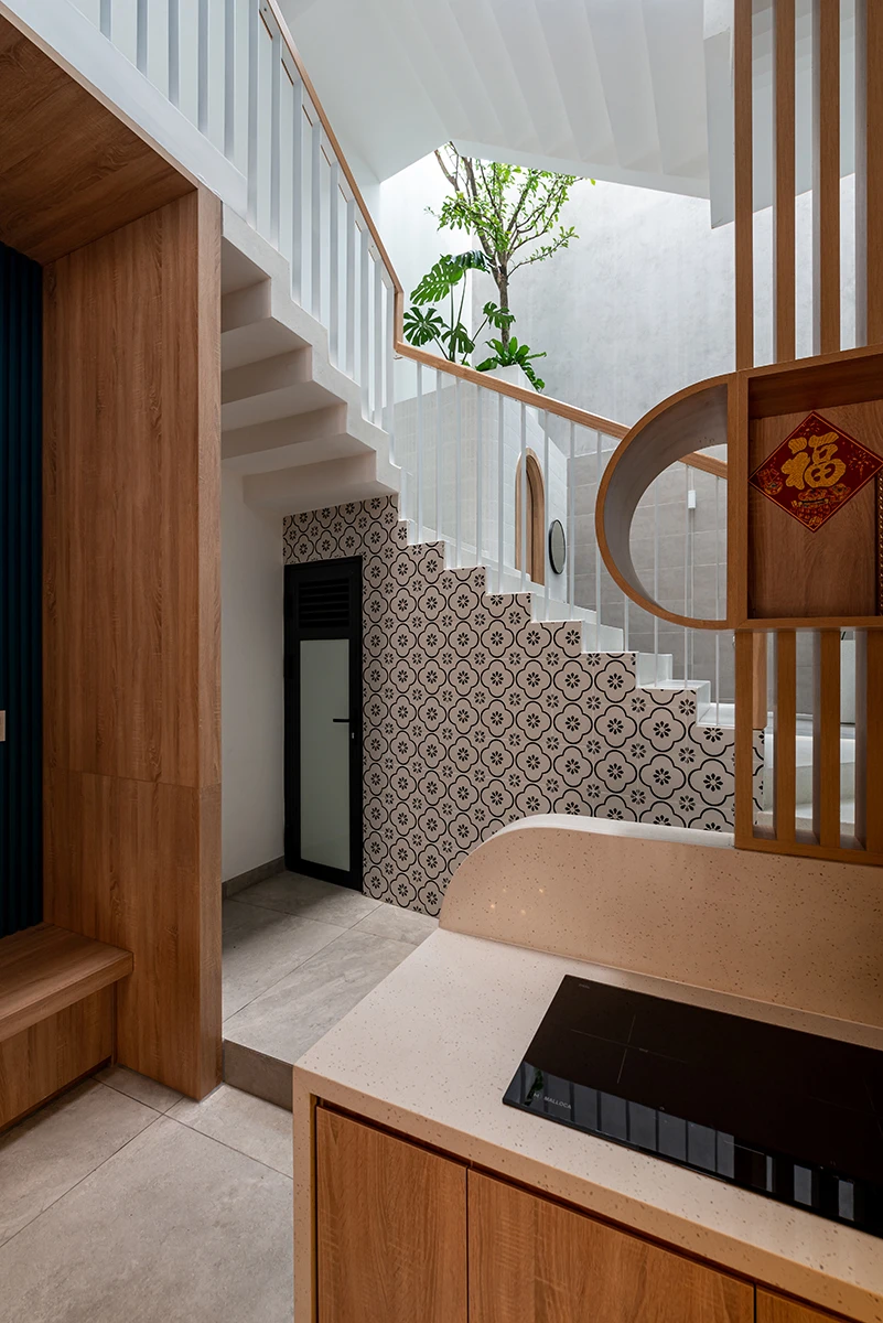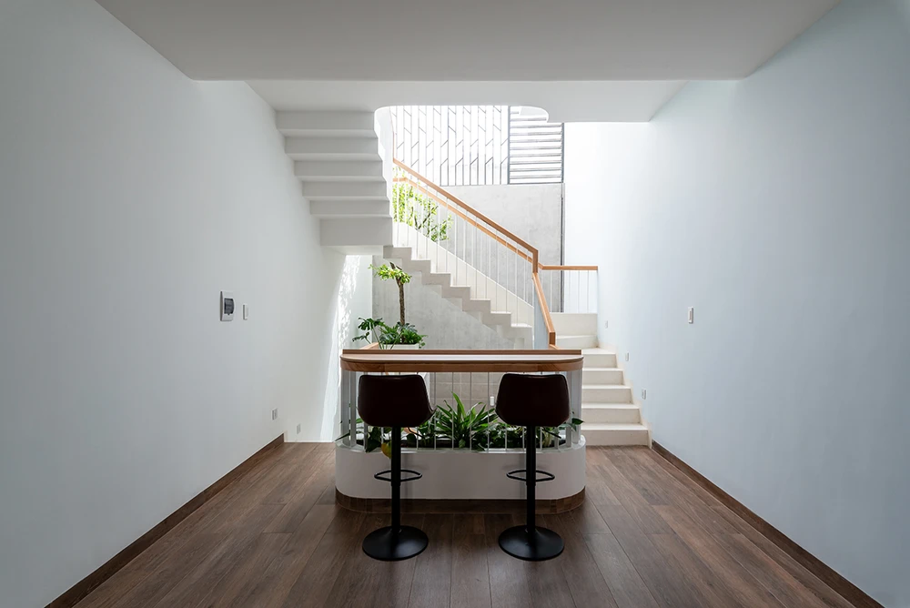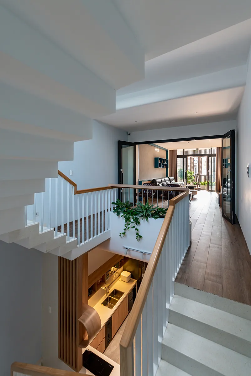 Kiến trúc sư chọn giải pháp đưa cầu thang ra cuối nhà kết hợp với khoảng chừa thông thoáng 1 m tạo thành một giếng trời lớn, giúp lấy nắng và gió cho toàn bộ ngôi nhà.