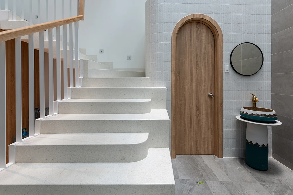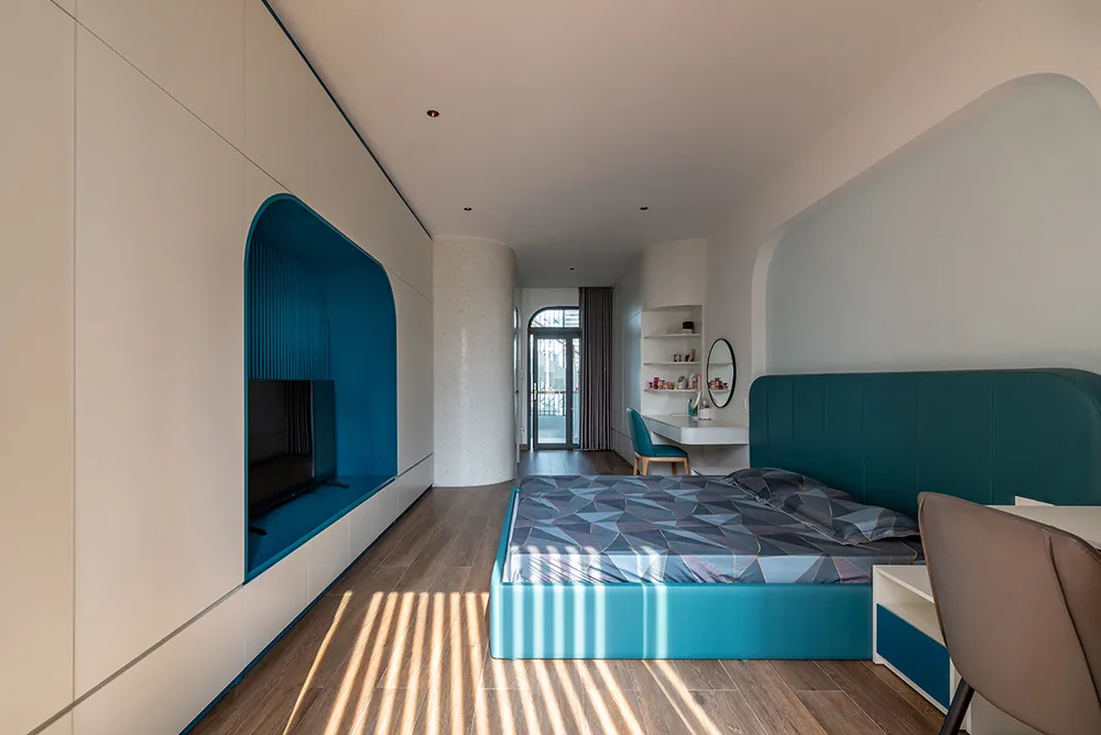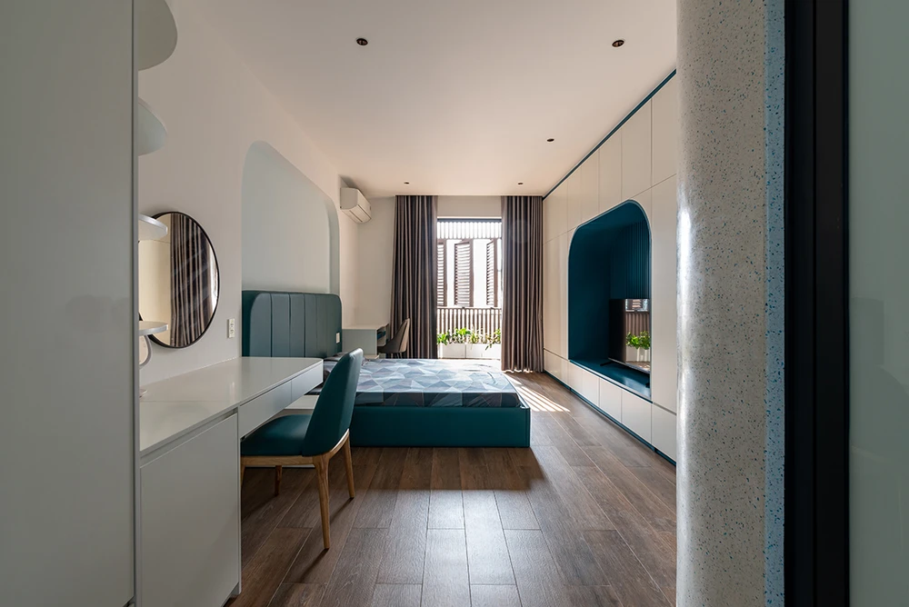 Lên tới lầu hai và ba là không gian phòng ngủ bố mẹ và con. Các chi tiết đường cong của cửa, tủ quần áo, khối nhà vệ sinh để tạo cảm giác nhẹ nhàng thư giãn.