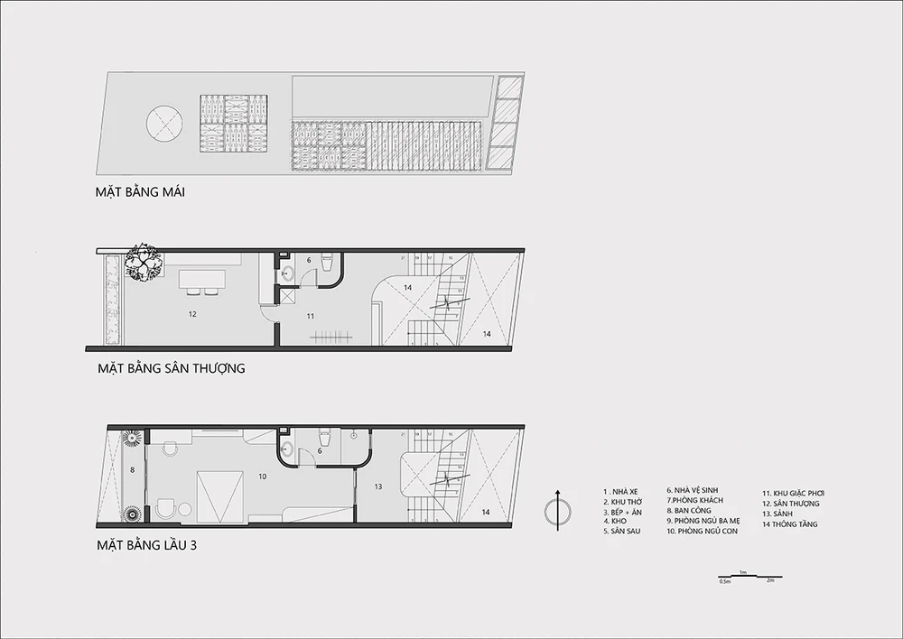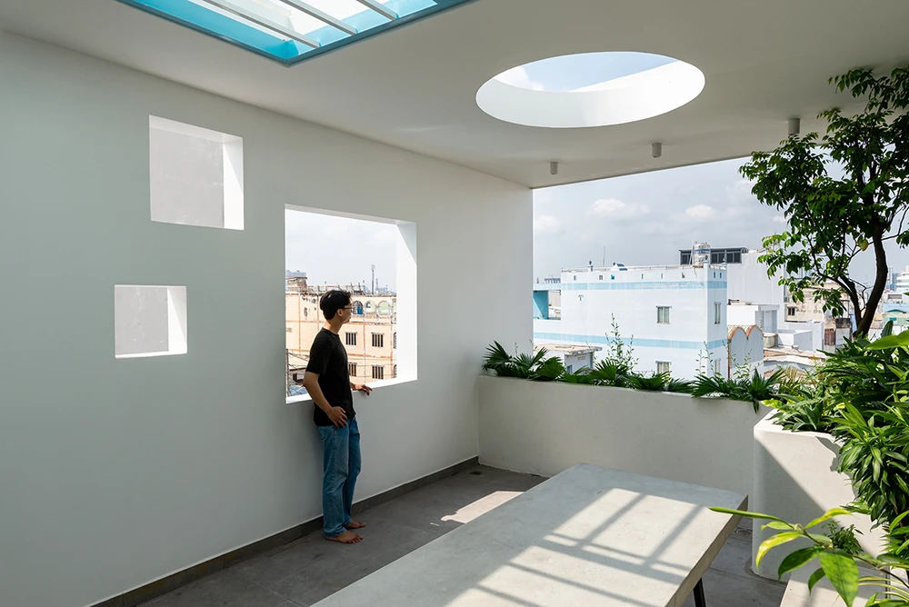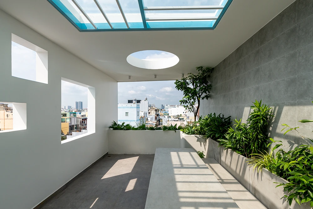 Sân thượng được bố trí khu giặt phơi nằm bên trong nhà nhưng có mái kính lấy nắng tiện và gió được lấy từ ô thông tầng sau nhà. Phía trước là khu thư giãn và có thể tổ chức tiệc nên bố trí thêm bếp nhỏ và bàn ăn với các ô trống nhiều hướng khác nhau.