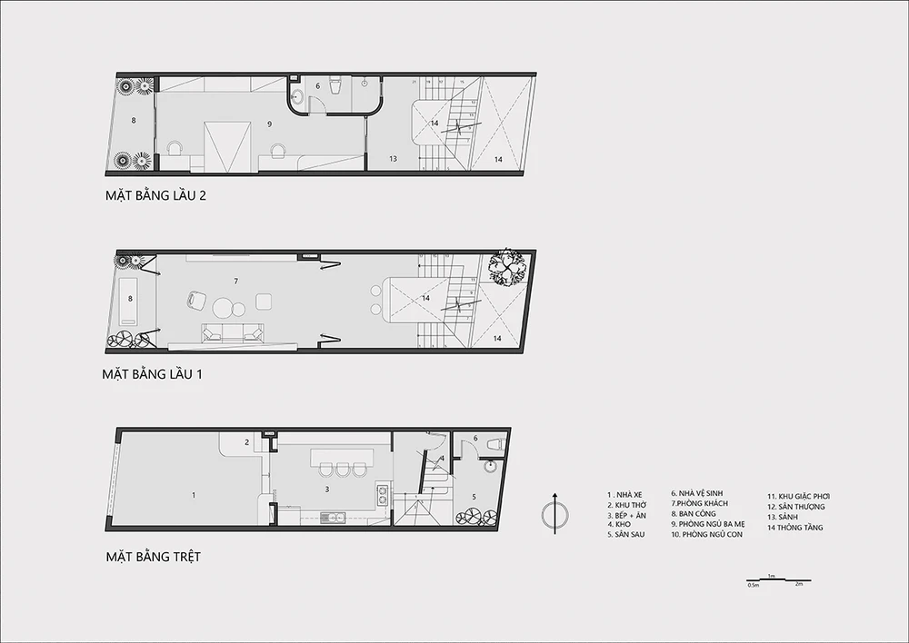 Kiến trúc sư đưa phòng khách lên tầng lầu một và mở rộng khu thông tầng để kết nối với tầng trệt dễ dàng. Tầng trệt dùng để xe ô tô, bếp ăn và có một khu thờ nhỏ.