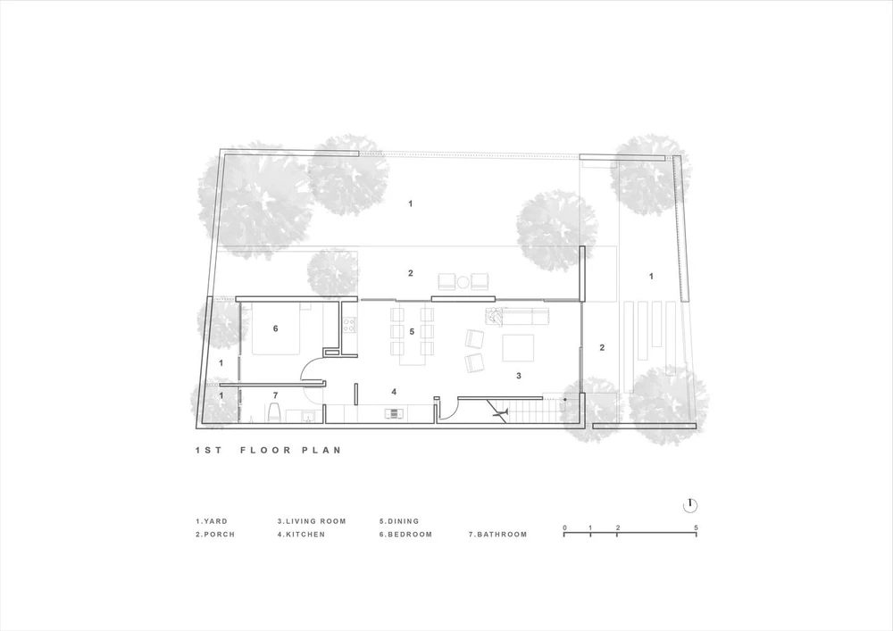 Tầng trệt được thiết kế là những không gian giao tiếp linh hoạt được bố trí dưới mái hiên rộng.
