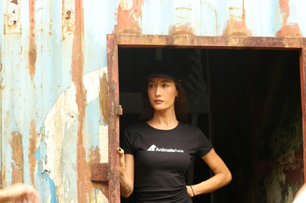 Maggie Q đứng trong container từng là nơi nuôi nhốt 19 cá thể gấu tại Bình Dương. Ảnh: TỔ CHỨC ĐỘNG VẬT CHÂU Á
