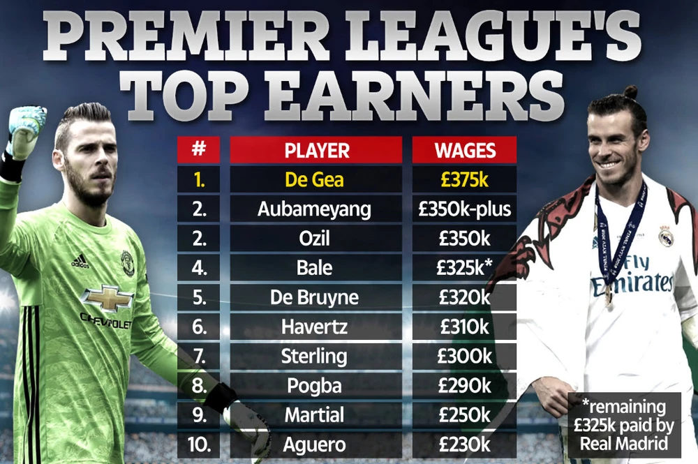 Theo đó, thủ thành số 1 của Manchester United, David de Gea là người đứng đầu trong danh sách này với mức lương 375.000 bảng Anh/tuần (hơn 11 tỉ đồng/tuần). Dù sa sút phong độ ở mùa giải trước nhưng David de Gea đã lấy lại niềm tin của người hâm mộ “quỷ đỏ” bằng màn trình diễn xuất sắc từ đầu mùa bóng đến nay. Vì thế, không mấy ai còn cảm thấy ghen tỵ và bất công khi De Gea nhận mức lương cao ngất ở Premier League.