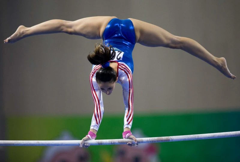 Farah Ann đang thi đấu nội dung xà lệch tại giải thế giới.