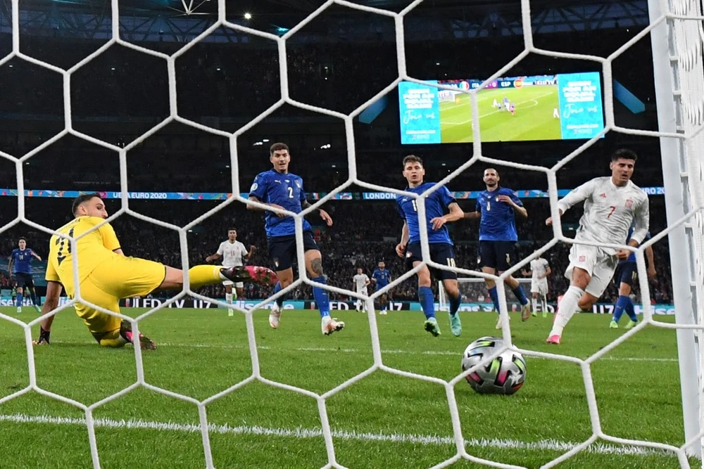 Khi mà người hâm mộ cũng như ban huấn luyện Tây Ban Nha đứng ngồi không yên vì bàn thắng gỡ hòa mãi chưa đến, thì bất ngờ Morata có pha phối hợp trung lộ đầy táo bạo với Dani Olmo. Sau đó, anh thoát xuống tung cú đá chân phải vào góc gần hạ gục thủ thành Donnarumma trong ánh mắt ngỡ ngàng của tất cả. Pha bóng diễn ra trong chớp mắt với chỉ hai cái bóng áo trắng đã khoan thủng khối bê tông Azzuri.