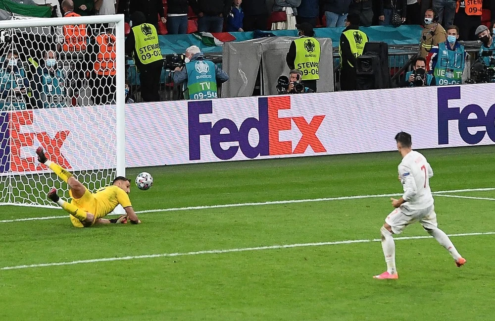 Ánh mắt Morata tội nghiệp chất chứa nhiều nỗi niềm dõi theo Jorginho đang bước lên. Một động tác nhảy chân sáo quen thuộc và cũng đầy bẩn lĩnh, bóng từ từ bay qua tay thủ môn Unai Simon. Chân sút Morata tận cùng tuyệt vọng, nhìn khoảnh khắc các cầu thủ Ý điên cuồng ăn mừng chiến thắng, rồi lại ngước sang nhìn các đồng đội đổ gục xuống sân.
