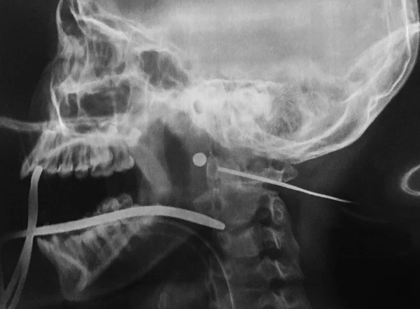 Qua chẩn đoán hình ảnh xác định viên đạn hình tròn nằm trong cổ của bệnh nhi.