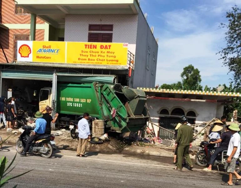Vụ tai nạn xảy ra sáng 6-5 trên quốc lộ 1A đoạn qua xóm 14, xã Diễn An, huyện Diễn Châu, Nghệ An. Xe chở rác tông xe máy rồi lao lên vỉa hè, đâm vào nhà dân làm ba người bị thương nặng.