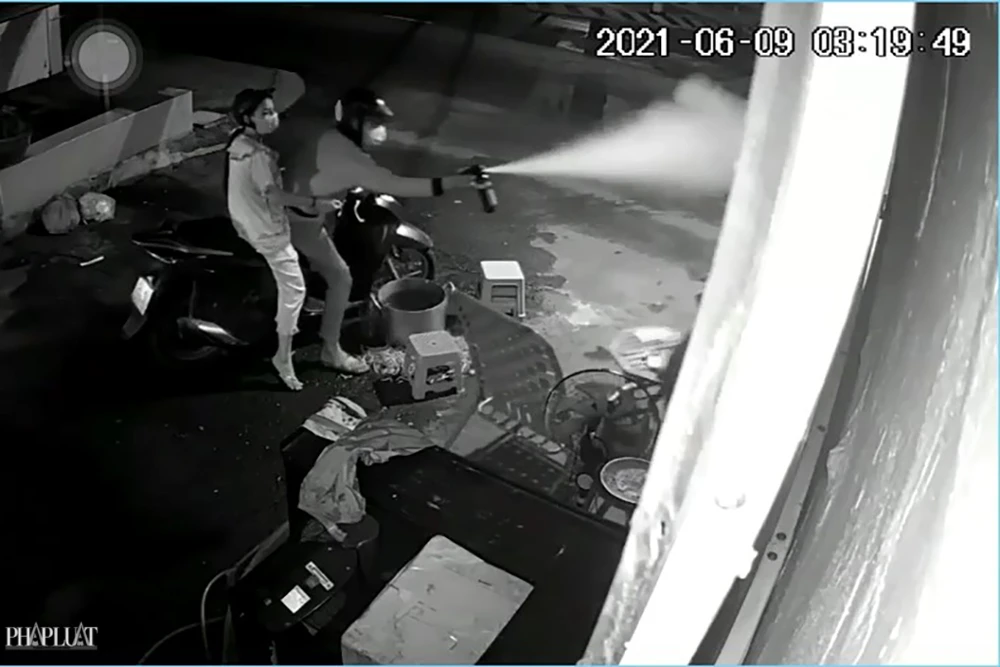 Vài giây sau, nhóm người đi xe máy vòng xe lại chỗ chị K đang ngồi. Người nam chạy xe máy chở theo cô gái lấy ra một bình xịt hơi cay, nhảy xuống, xịt thẳng vào người phụ nữ. Nạn nhân bỏ chạy vào nhà trong hoảng sợ.