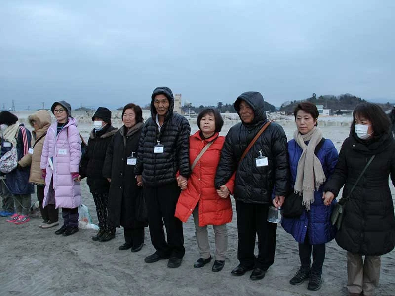 Các học viên của trường tập trung bên bờ biển để cầu nguyện cho các nạn nhân của thảm họa Fukushima. Ảnh: IKIKATA-JYUKU