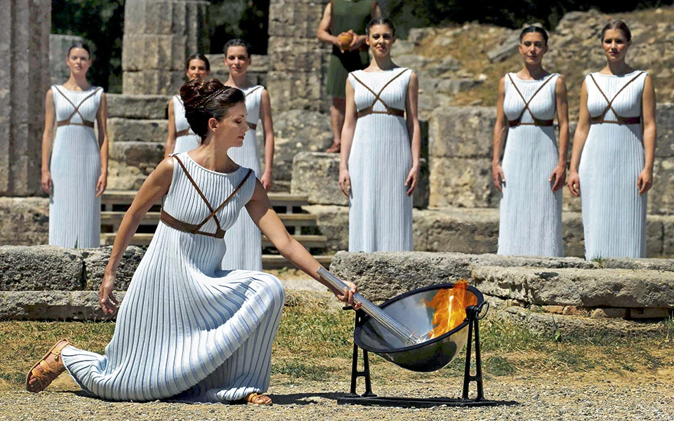Lễ lấy lửa từ mặt trời (qua kính hội tụ) ở thành cổ Olympia diễn ra đơn giản vì dịch bệnh COVID-19, không có nghi thức các VĐV cầm đuốc chạy diễu hành ở Hy Lạp trước khi...lên máy bay.