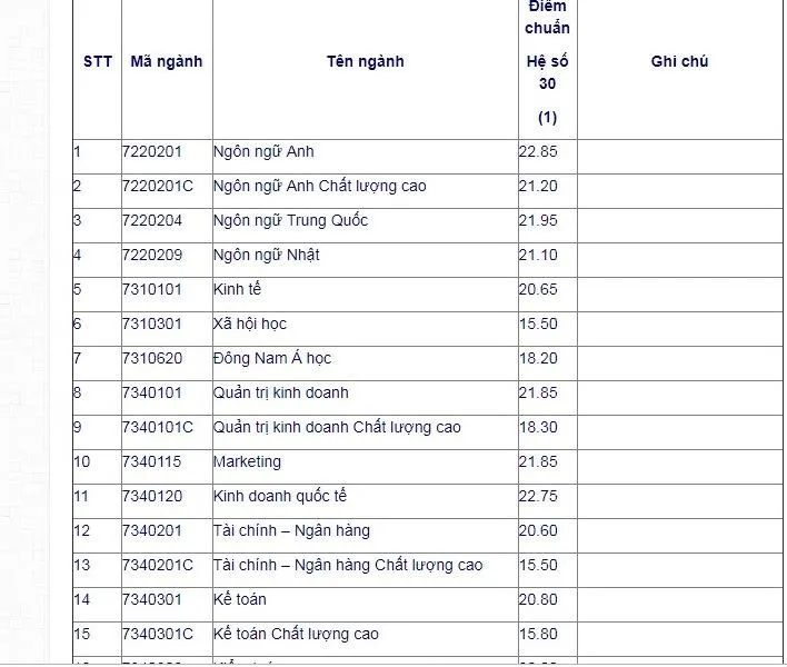 Theo công bố, điểm trúng tuyển của trường chia làm ba nhóm chính. Nhóm ngành có điểm trúng tuyển cao, từ trên 21 điểm gồm: Ngôn ngữ Anh, ngôn ngữ Trung Quốc, ngôn ngữ Nhật, quản trị kinh doanh, kinh doanh quốc tế, quản trị nhân lực, Marketing.