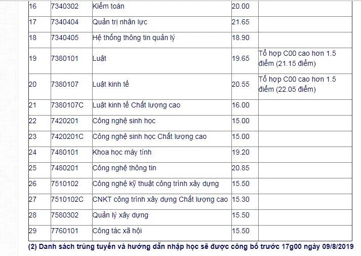 Nhóm ngành có điểm thấp bằng điểm sàn hoặc cao hơn (từ 15 điểm đến dưới 19 điểm), gồm: Đông Nam Á, công nghệ sinh học, hệ thống thông tin quản lý, công nghệ kỹ thuật công trình xây dựng, quản lý xậy dựng, xã hội học và công tác xã hội.