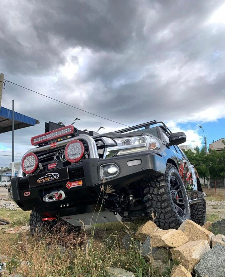 Không chỉ dán decal, Land Cruiser còn được gắn thêm một cơ số trang bị khủng chuyên dành cho xe địa hình như ống thở, ăngten, đèn trợ sáng trên mui và trước cản xe không chỉ tạo tính hầm hố cho xe, mà khả năng trợ sáng vào ban đêm khi đi ở địa hình rất cao. Đặc biệt cản trước còn được trang bị tời Warn Zeon Platinum 12S cáp mềm của Mỹ, sức kéo 12,000 lbs ~ 5,5 tấn, tích hợp remote điều khiển từ xa, hiển thị các thông số kỹ thuật trên màn hình remote.