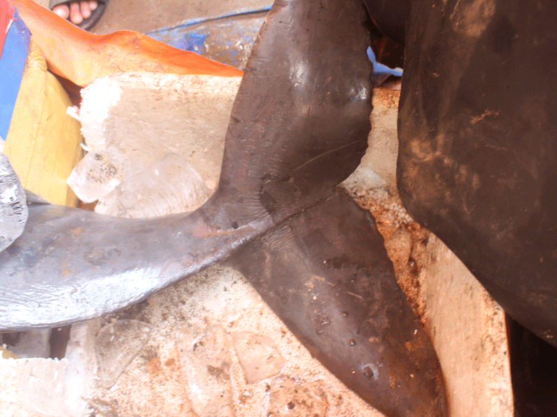 Xác cá lạ nghi là loài cá nược quý hiếm nguy cơ tuyệt chủng được ngư dân bắt được. Ảnh: ĐÔNG HÀ