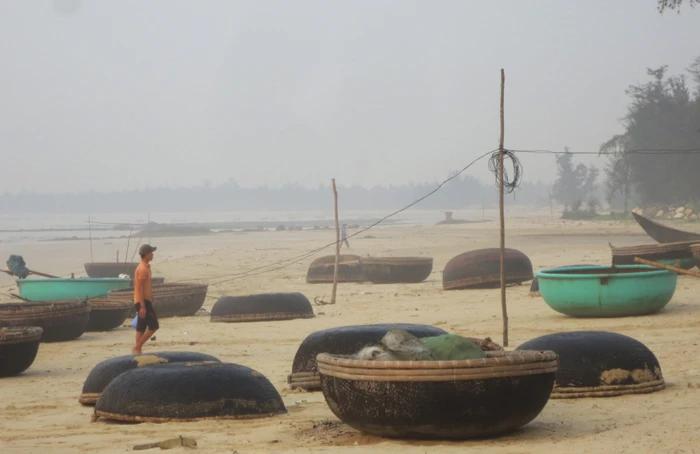 Những chiếc thuyền thúng được đưa lên bãi cát. Những ngư dân nơi đây cho biết "mấy ngày trước cũng có một số người về thu mua cá chết và cá lờ đờ - sắp chết với giá 5.000 đến 6.000 đồng/kg, tuy nhiên từ sáng nay không thấy nữa".