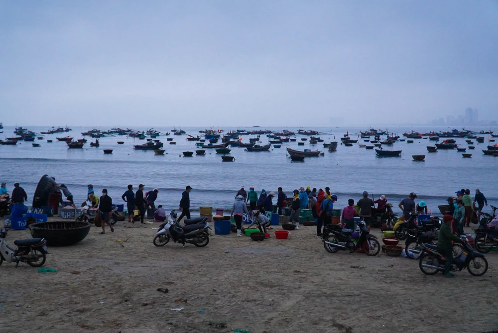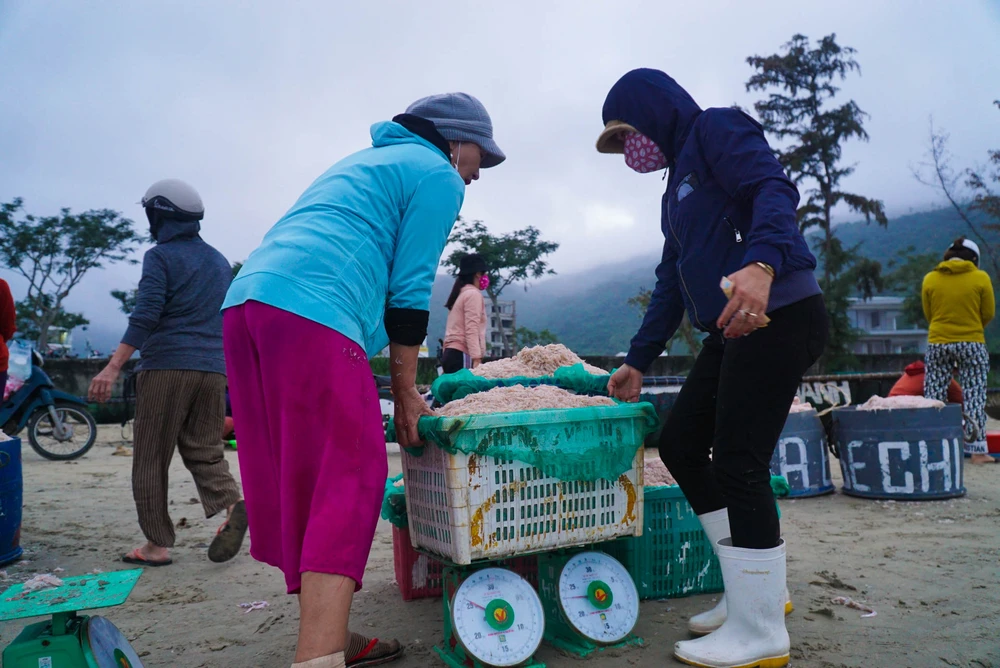 5 giờ sáng, khu vực bãi biển ở phường Mân Thái, Thọ Quang đã tấp nập người mua, bán ruốc biển. Ảnh: BT