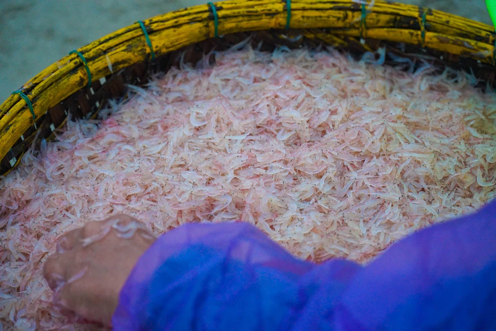 Từng thúng ruốc tươi cập bờ chờ thương lái đến thu mua. Ảnh: BT