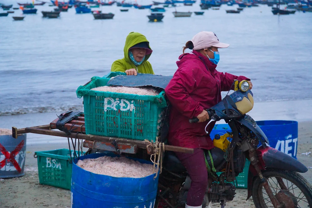Nhiều thương lái đi xe máy xuống tận bãi để chở ruốc đưa đi chợ bán sớm. Ảnh: BT
