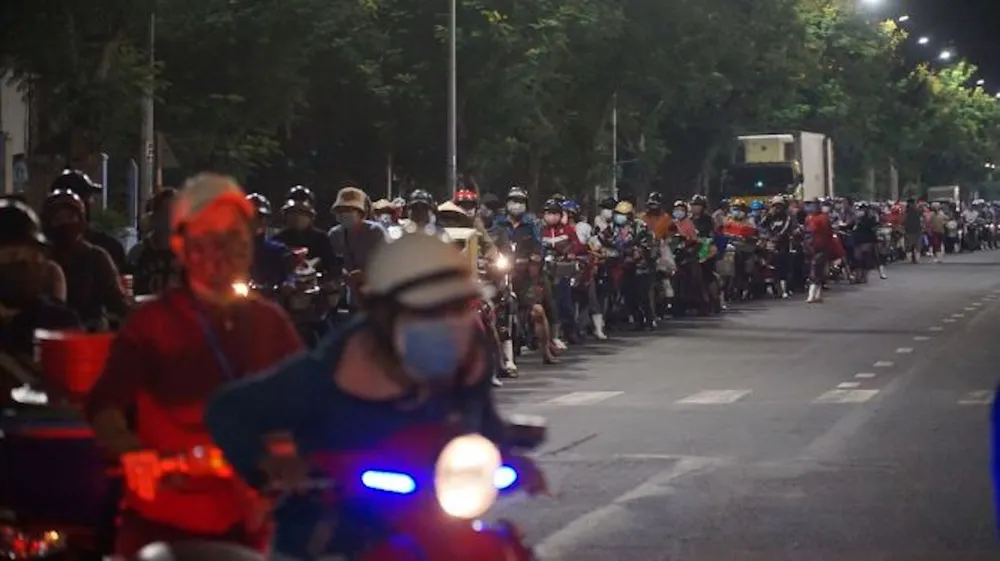 Theo ghi nhận của PLO, lúc 4 giờ 30 ngày 16-8, hàng trăm ngư dân, thương lái tại Đà Nẵng xếp hàng dài trên tuyến đường Vân Đồn (quận Sơn Trà) để chờ vào khu vực cảng cá Thọ Quang xét nghiệm COVID-19.