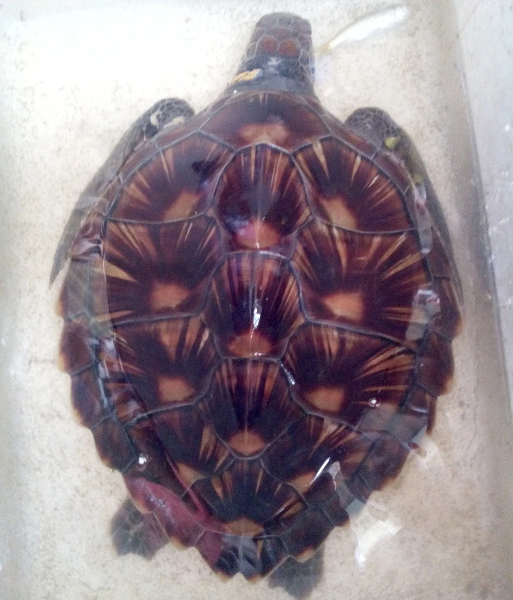 Con đồi mồi biển do hai ngư dân Nguyễn Văn Thắng và Phan Văn Thới (cùng trú thôn Yên Hải, xã Xuân Yên, huyện Nghi Xuân, Hà Tĩnh) bắt được. Ảnh: ĐL