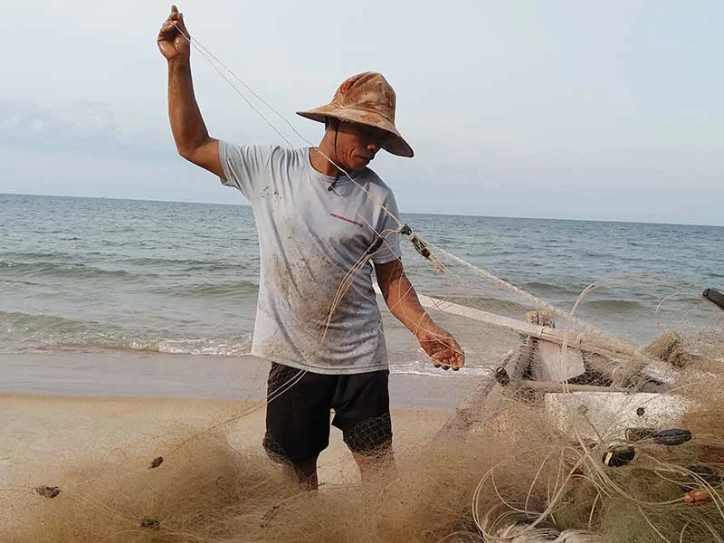 Ngư lưới cụ của ngư dân các xã bãi ngang huyện Phú Vang bị cá nóc cắn phá gây thiệt hại nặng. Ảnh: NGUYỄN DO
