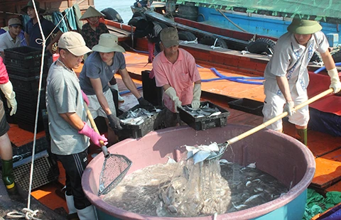 Cá từ thuyền anh Hoàng Nồm đang được thương lái thu mua. Ảnh: VIẾT LONG