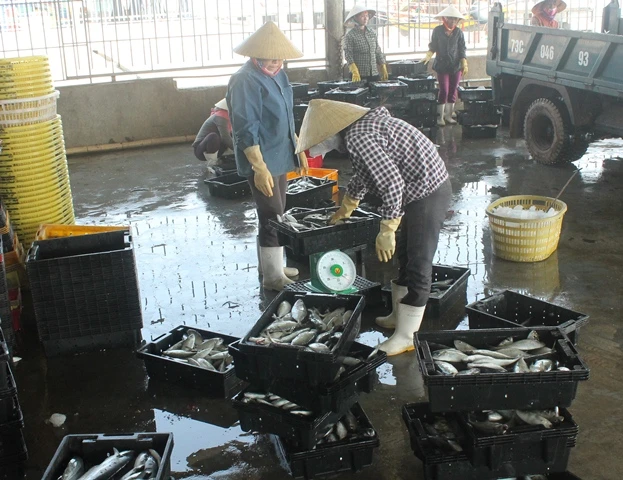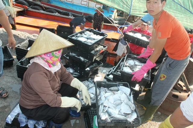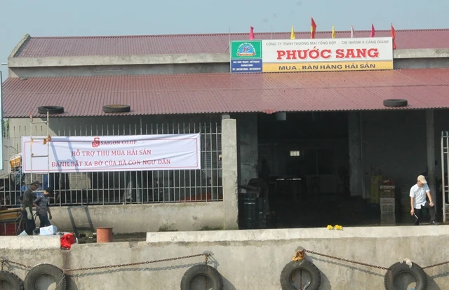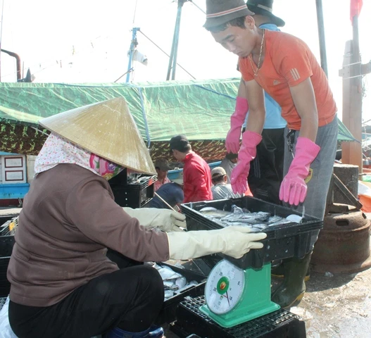 Chiếc tàu cá QB-98145 của anh Hoàng Nôm (thị xã Ba Đồn, Quảng Trạch) vừa cập cảng Gianh sau năm ngày lênh đênh trên biển. Nhân viên của Công ty TNHH Thương mại tổng hợp Phước Sang đã đứng sẵn ở bờ để thu mua toàn bộ 21 tấn hải sản trên tàu này.