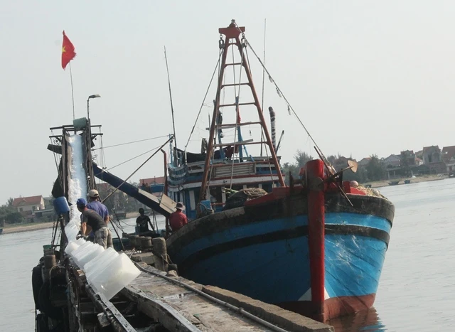 Tàu ngư dân Quảng Bình lần lượt đưa đá vào hầm ướp cá để ra khơi.