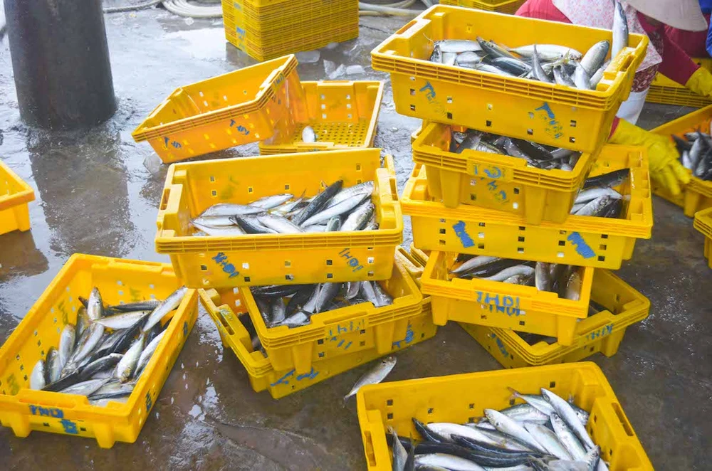 Phân loại cá nục ngay bến cảng để nhập cho thương lái. Cá vừa vào bến thì đã có thương lái mua ngay. Ảnh: Văn Luận