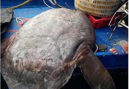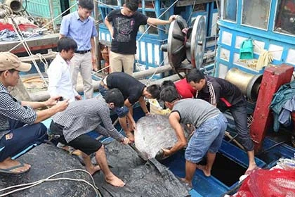 Trong lúc đánh bắt cá trên biển, con tàu của ông Huân phát hiện con “cá lạ” (rộng 1,4m dài 1,4 m) trọng lượng 100 kg mắc lưới. Khi đưa lên tàu thì con cá này đã chết.