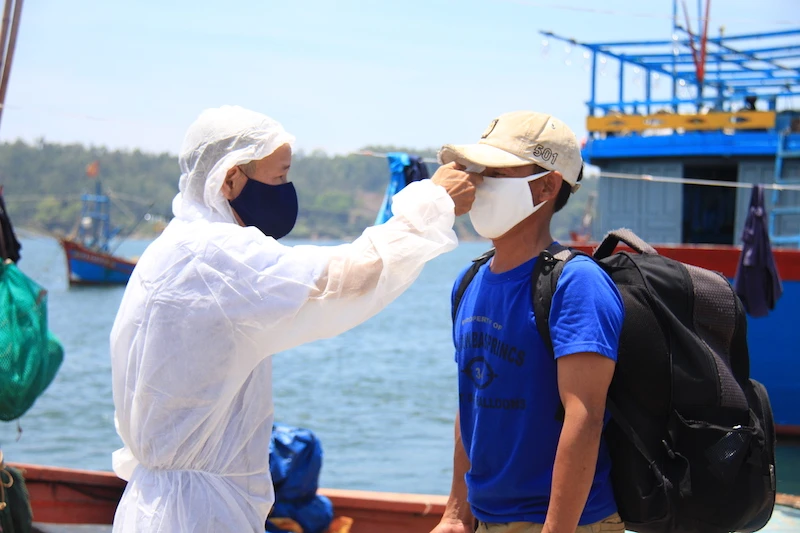 Các ngư dân được kiểm tra thân nhiệt tại cảng Sa Kỳ. Ảnh: TN