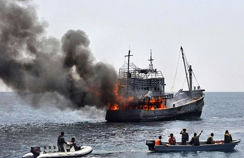 Indonesia phá hủy tàu đánh cá nước ngoài đánh bắt trái phép. Ảnh: TÂN HOA XÃ
