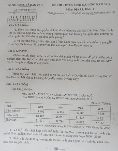 Thí sinh Lường Duy Khánh ở Lai Châu thi vào ngành Luật Dân sự trường ĐH Luật Hà Nội cho biết đề thi Địa lý năm nay khá dễ. Không có phần chung phần riêng như những năm trước. Đề thi không đánh đố thí sinh và có hai câu liên quan đến vấn đề biển đảo. “Đây là phần em nghĩ sẽ có trong đề thi nên đã chuẩn bị rất kỹ. Em khá tự tin với bài làm của mình và dự đoán sẽ được 7-8 điểm”. Khánh cho biết.