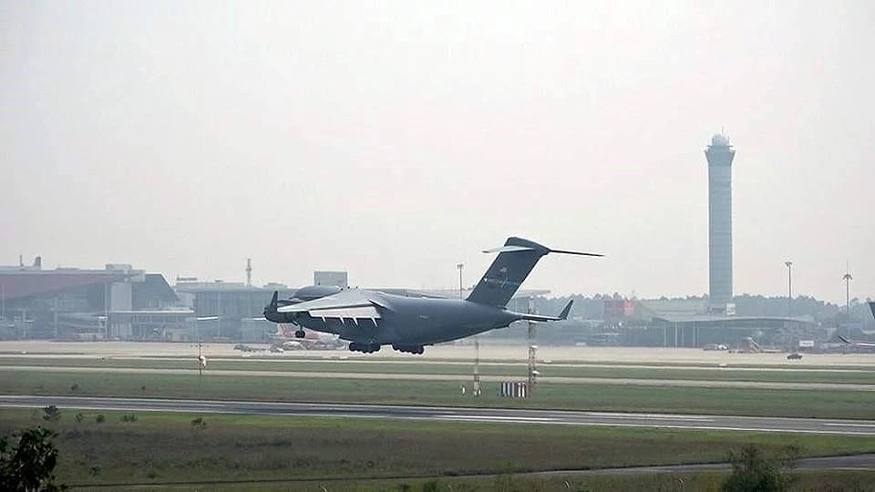 Khoảng 13 giờ chiều nay, 20-2, một máy bay vận tải C-17 với biệt danh "Globemaster - bá chủ địa cầu" của không quân Mỹ hạ cánh xuống sân bay Nội Bài của Hà Nội.