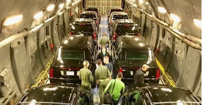Trong ảnh, đoàn xe phục vụ Tổng thống Donald Trump được xếp gọn bên trong vận tải cơ C-17 Globemaster III, chỉ vài ngày trước khi ông chủ Nhà Trắng đến Đà Nẵng dự Tuần lễ cấp cao APEC năm 2017.