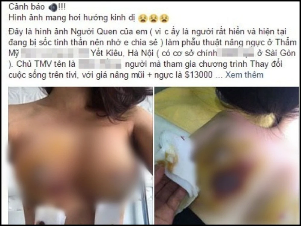 Vài ngày gần đây, một tài khoản Facebook chia sẻ hình ảnh về việc một phụ nữ bị biến chứng sau khi phẫu thuật nâng ngực tại Hà Nội.