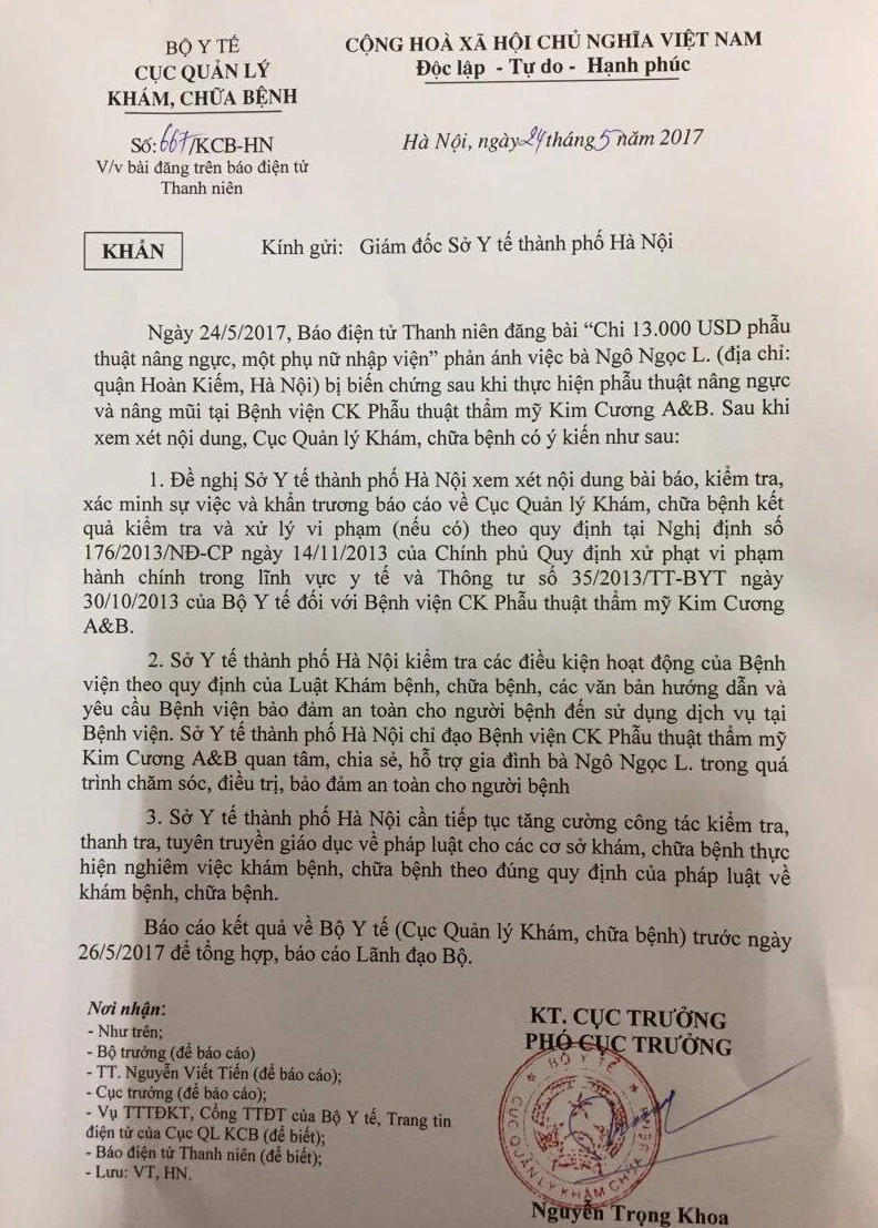 Công văn khẩn của Bộ Y tế gửi Sở Y tế TP Hà Nội về vụ phẫu thuật nâng ngực. Ảnh: HG