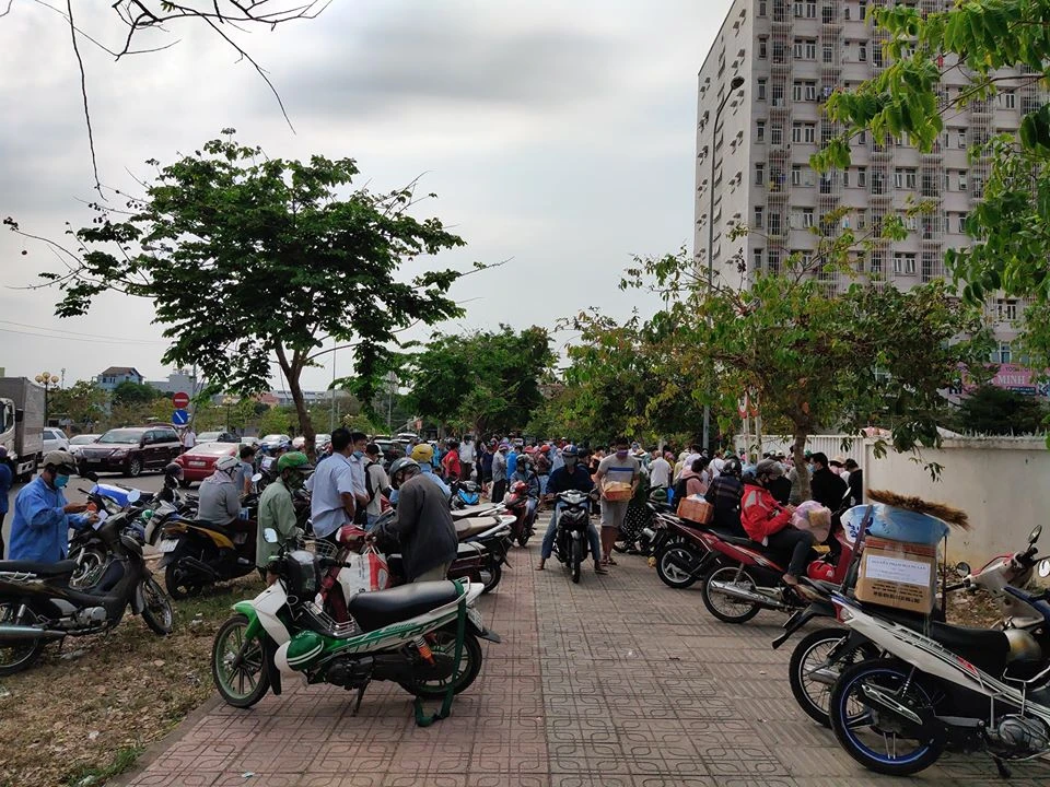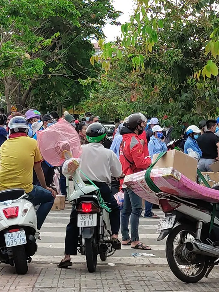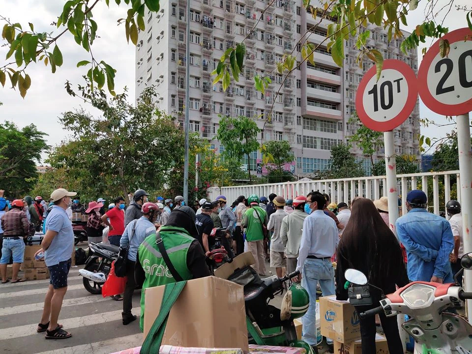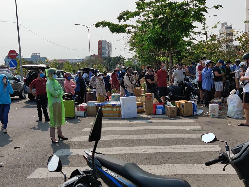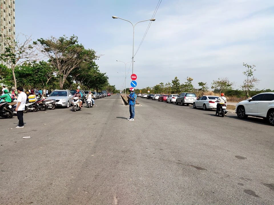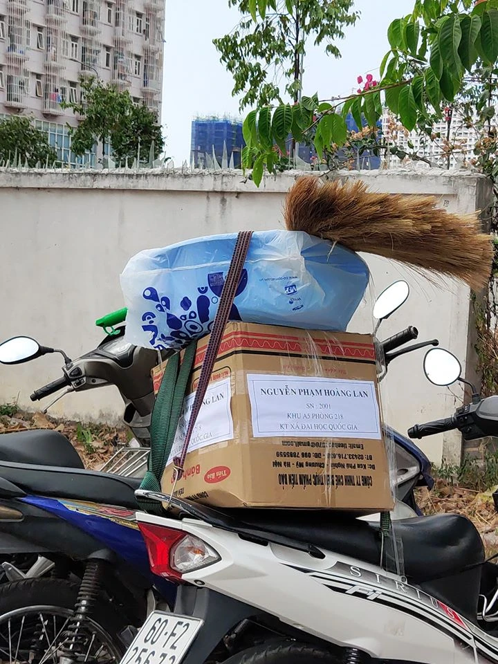Chính vì thế mà càng lúc số người tụ tập, hàng hóa, xe cộ vẫn đổ về dồn ứ nơi này. Tại khu A ký túc xá ĐH Quốc gia, xe hơi khoảng trăm chiếc đậu thành hai ba hàng dài dọc kín hai bên long đường. Xe máy dựng thành dãy dài trên lề đường dọc theo hàng rào khu ký túc xá đang cách ly.
