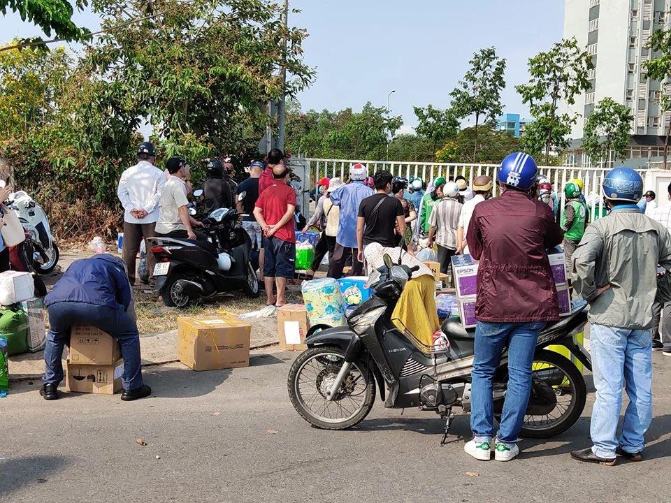 Hàng trăm người, xe cộ, hàng hóa nghẹt đầy cổng khu cách lý ký túc xá ĐH Quốc gia TP.HCM khu A sáng 24-3. Ảnh: HÒA BÌNH
